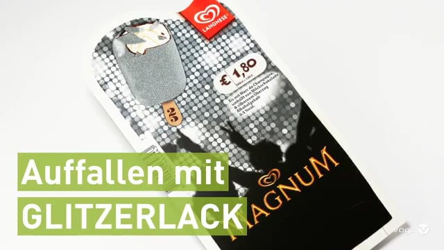 Glitzerlack verleiht Ihren Print-Produkten einen besonders edlen Hingucker. Die funkelnden Pigmente fangen garantiert jeden Blick ein und lassen den potentiellen Kunden bei Ihrer Werbeanzeige, Ihrem Aufsteller oder ähnlichem verweilen.