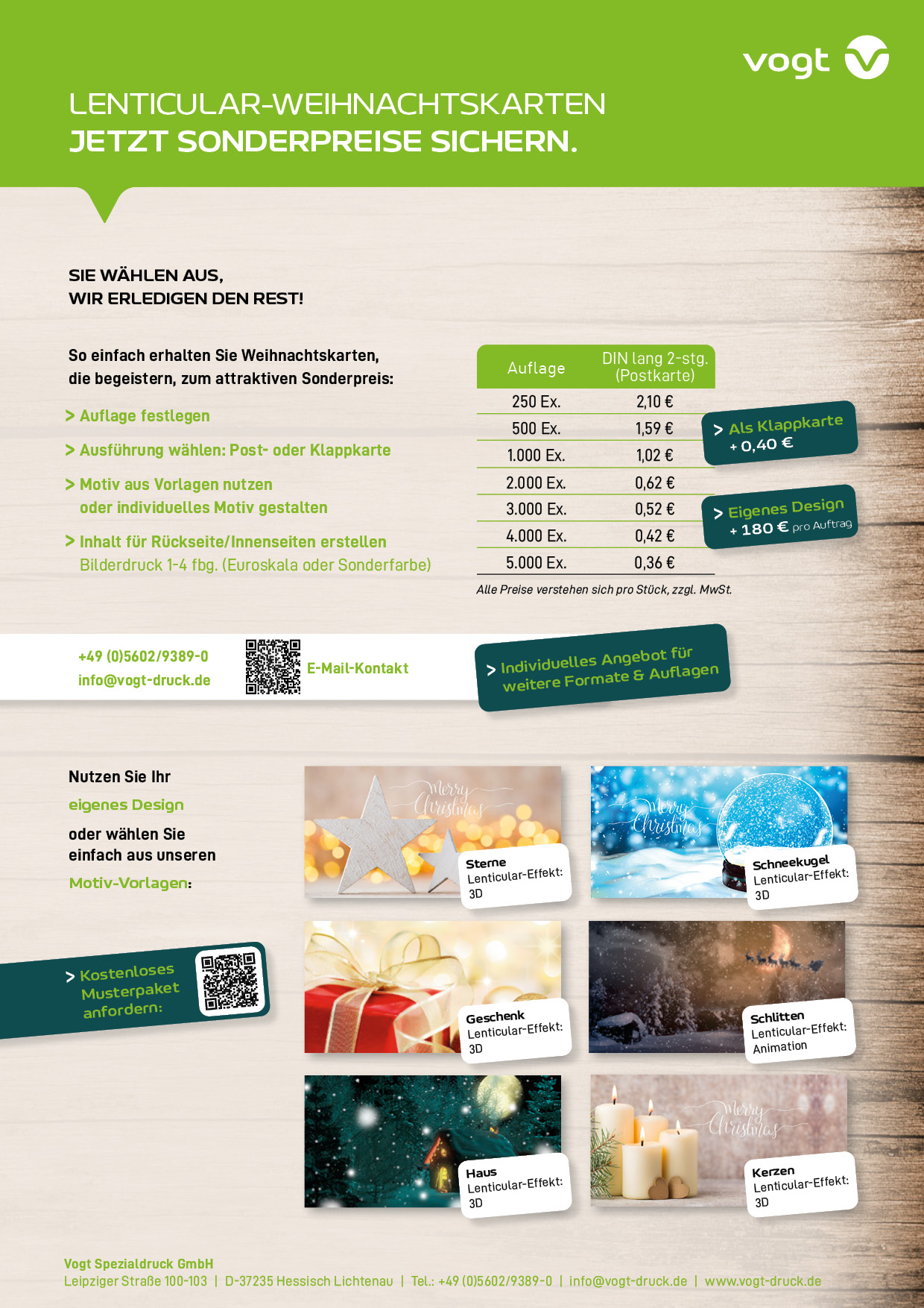 Solche Wow-Effekte gibt’s nur mit unseren Lenticular-Weihnachtskarten, dank faszinierender Animation und beeindruckendem 3D-Effekt.